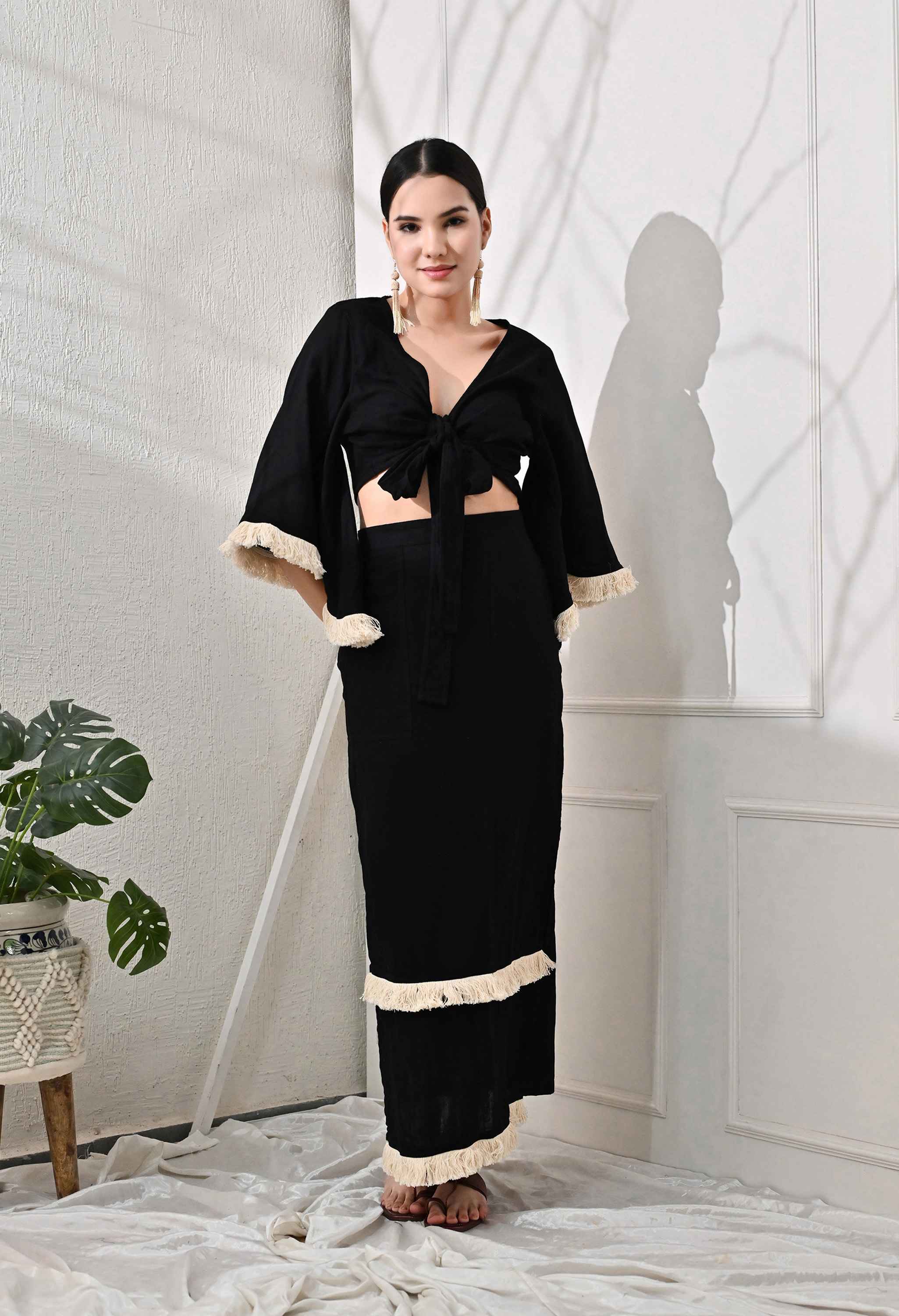 Embrace your inner beach babe with this dreamy set! Featuring a wrap-style top with flared bell sleeves and a double slit skirt, this outfit is all about flair and effortless silhouette. The fringe details add a playful touch, making it the perfect ensemble for sun-soaked days and breezy beach outings!