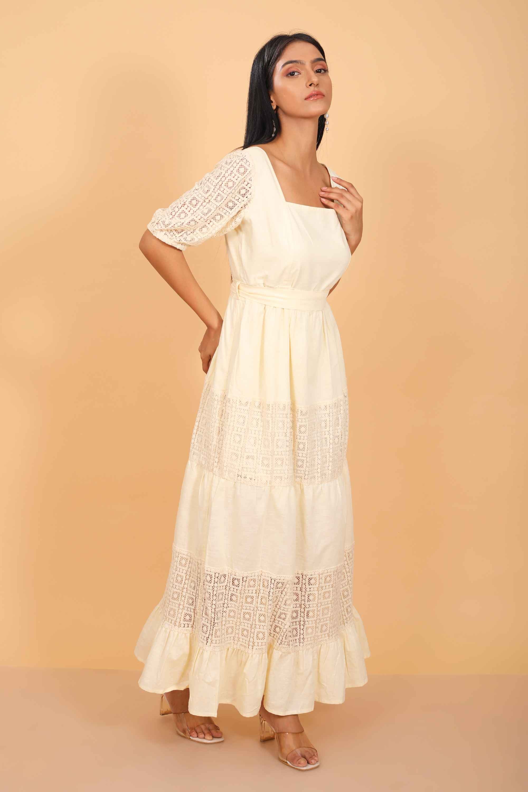 Step out in style with our chic tiered maxi dress, featuring pockets because we never miss them! Made from lightweight cotton linen, it has alternate tiers of crochet cotton for added texture. The tone-on-tone style exudes elegance, making it perfect for beach walks, day outings, or street hopping!