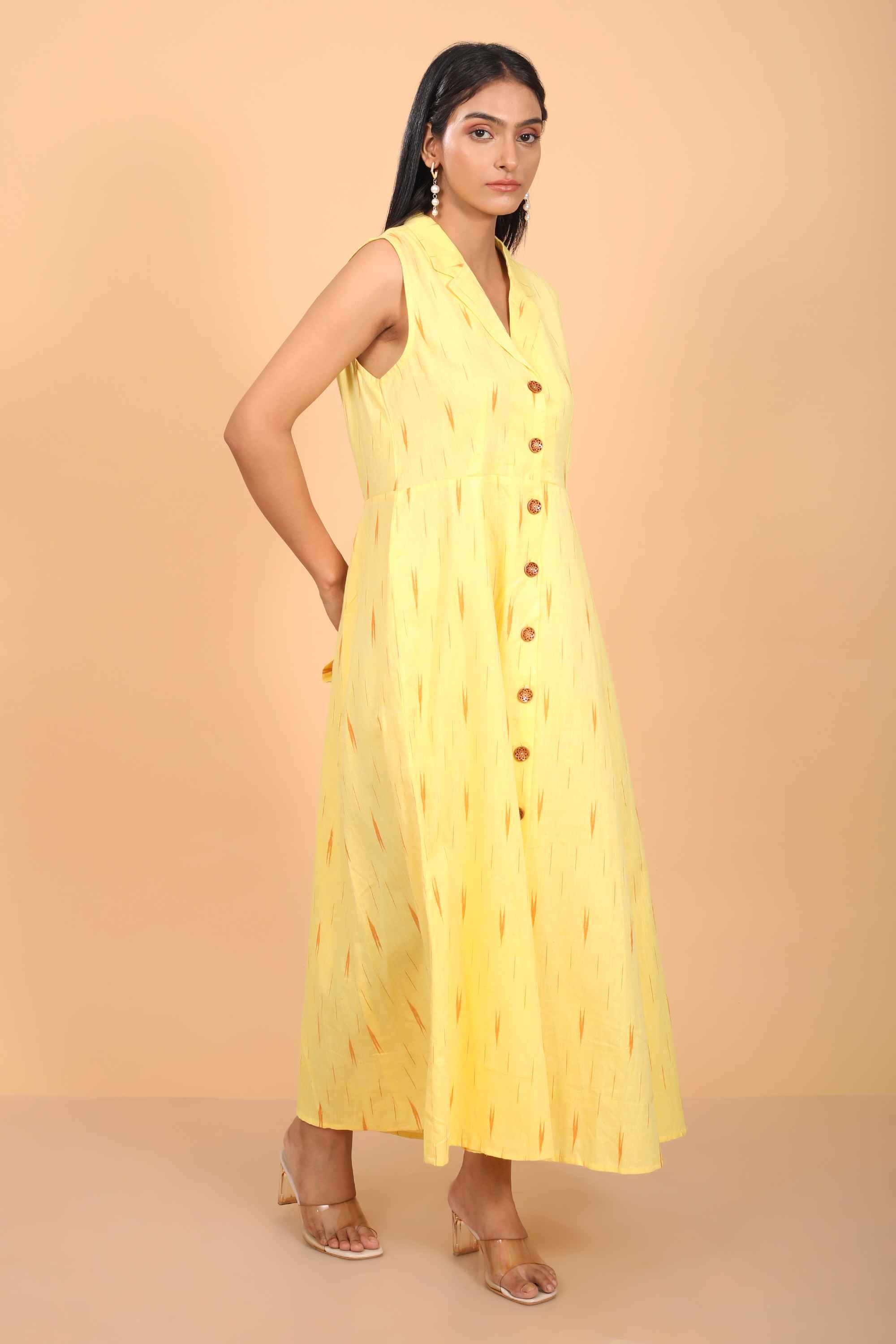 Introducing our cute shirt-style dress, crafted from exquisite ikkat fabric woven by the talented artisans of Bhagalpur. Its unique design stands out, making it a must-have for your wardrobe. Hurry and grab this limited edition piece before it's gone—plus, we never miss adding pockets for practicality!
