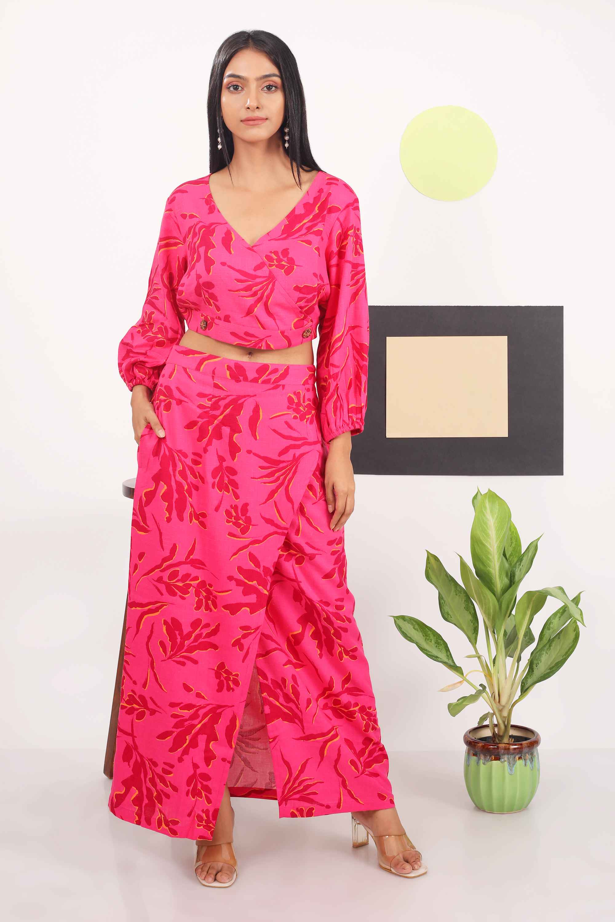 Elevate your style with our vibrant pink coord set! Featuring a long sleeve wrap crop top and a matching long skirt with a stylish slit, this set is designed for comfort and flair. Crafted from super fine cotton linen, it includes pockets for added practicality. The eye-catching monochrome prints make it a truly unique addition to your wardrobe!