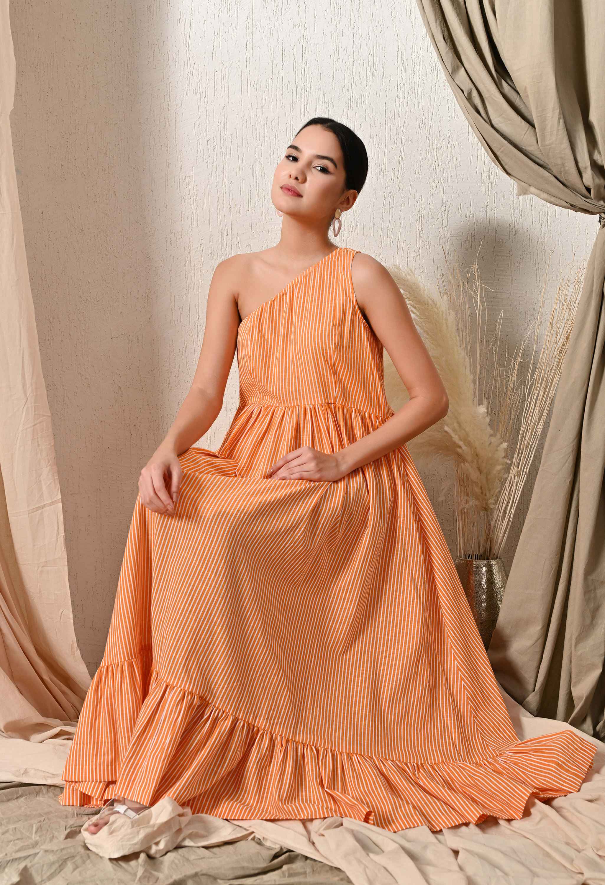 Elevate your style with our one-shoulder chic flowy maxi dress, featuring vibrant orange stripes that create a stunning visual impact. This elegant, cute, and classy dress is designed with pockets for added convenience, making it perfect for any occasion. Embrace effortless elegance and make a statement wherever you go!