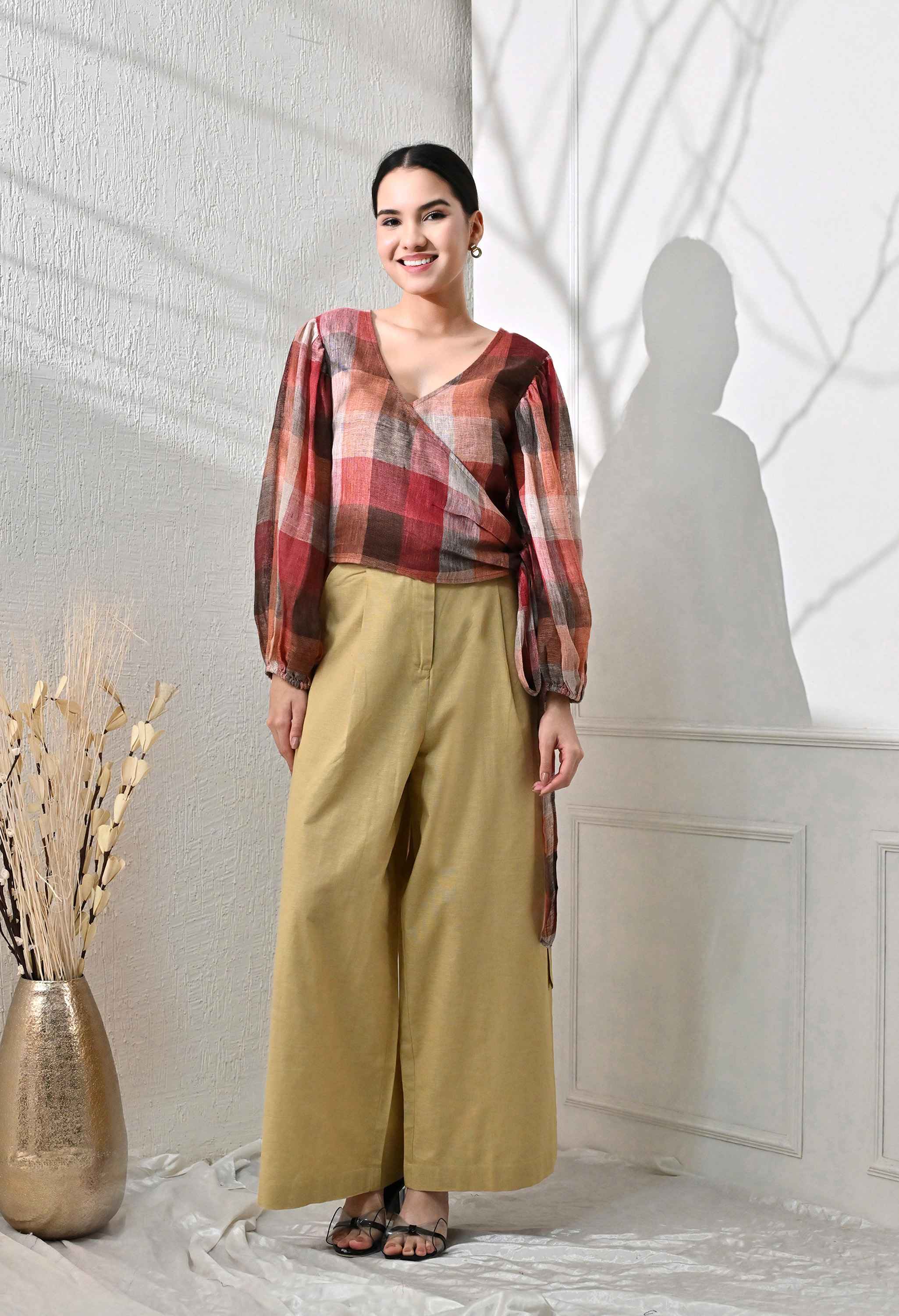 Back with the exceptional craftsmanship of Bhagalpur, this yarn-dyed, woven 100% linen checks fabric is pure love. Designed as a long belt wrap-style top, it adds a chic touch to your wardrobe. The beautiful design pairs effortlessly with any bottom, offering both elegance and comfort in one timeless piece!