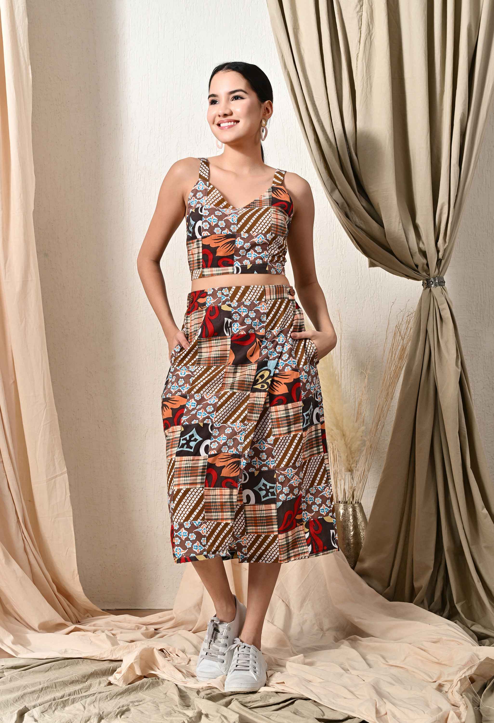 Introducing our unique coord set crafted from fabric patches, showcasing a super sustainable approach by using discarded fabrics stitched together for a stunning symmetrical design. The set features a strappy top with tie-back details and a cozy wrap skirt, making it a perfect blend of style and eco-conscious fashion. Style it up with your choice of jacket and a pair of sneakers or boots for a chic, versatile look!