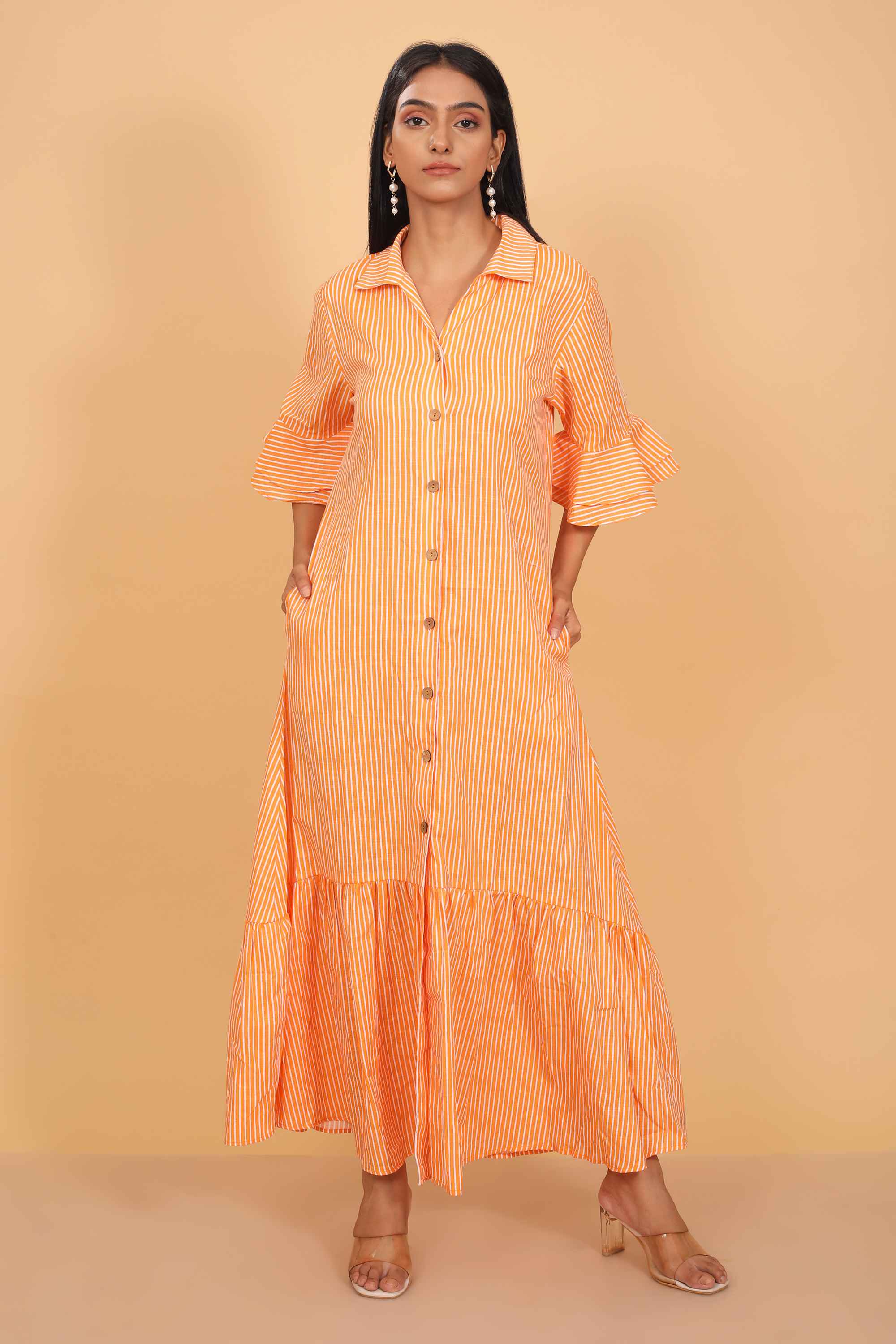 Here's our stylish shirt-style dress made from 100% cotton, featuring vibrant orange vertical stripes on a crisp white base. The unique flairy layer at the bottom adds a standout element to this chic design, making it a perfect choice for effortless elegance!